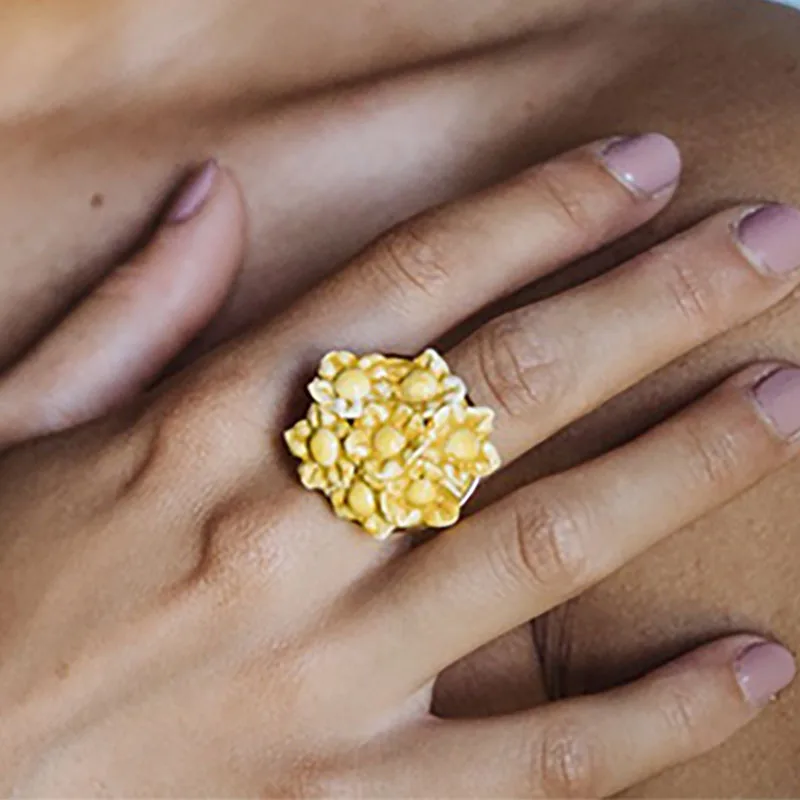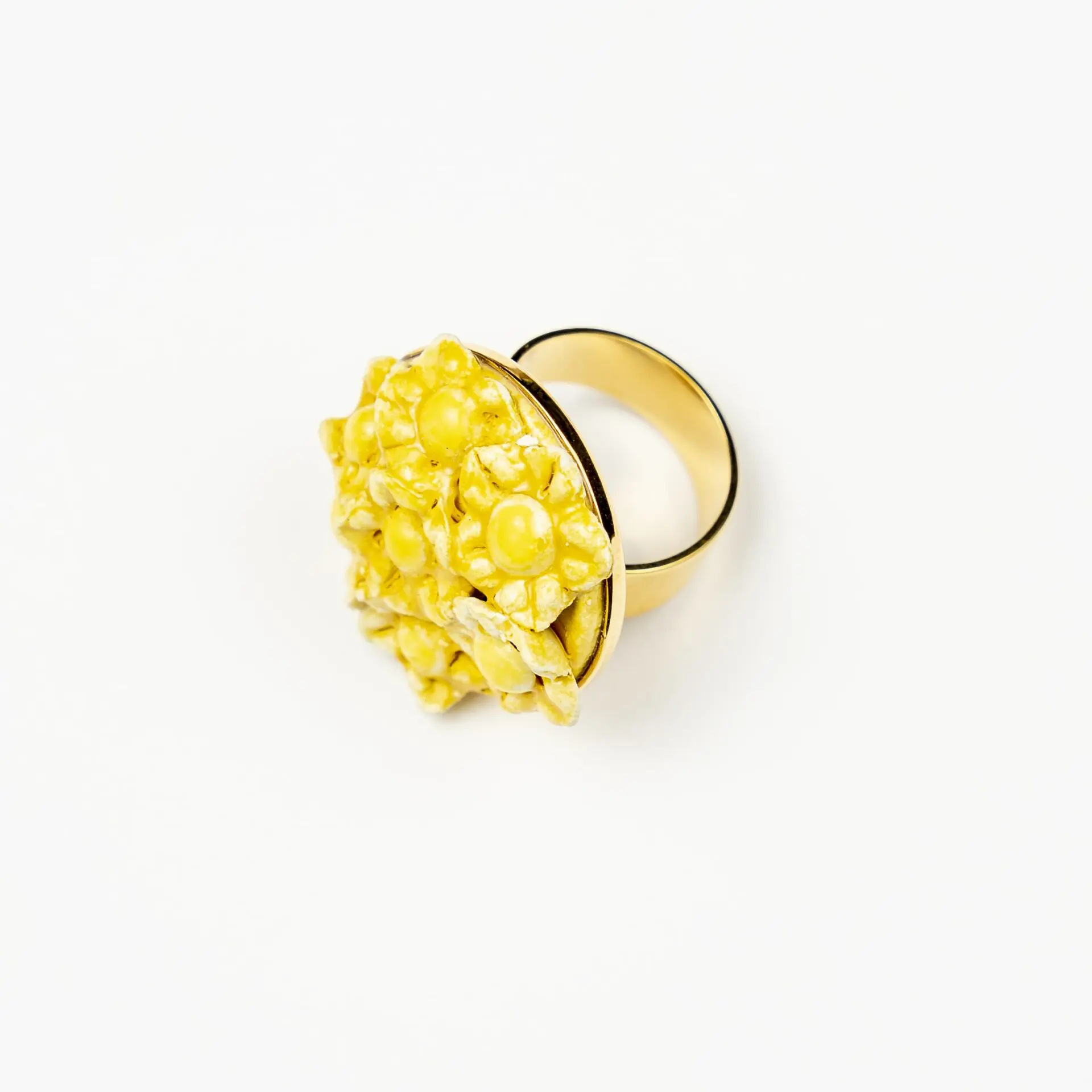 Questo anello è formato da piccoli fiori in ceramica realizzati uno ad uno a mano ed ancorati alla base dell’anello. L’argilla, terracotta bianca, viene cotta in forno di ceramica a 1000°C. La seconda cottura con colori e smalti avviene a 920°C. La base degli orecchini è a CLIP in ottone placcato oro. La placcatura è 1 micron di oro a 24 carati, anallergico in quanto esclude l’uso del nichel nelle fasi di lavorazione. Le perle e le pietre sono naturali e attaccate una ad una alla base della spilla