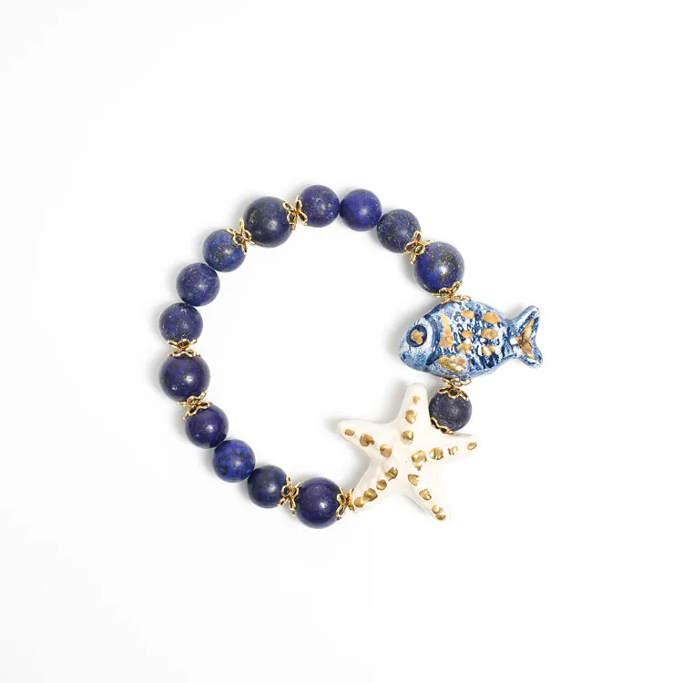 Bracciale di perle di pietra Lapislazzuli, pesce blu e conchiglia bianca in ceramica decorata a terzo fuoco. L’intero modello viene sezionato in due metà, svuotato scavando l’argilla in eccesso e quindi richiuso. Questa delicata operazione conferisce all’orecchino una piacevole leggerezza e una perfetta portabilità. Il bracciale è senza chiusura, facilissimo da indossare perché formato da un doppio filo elastico a 6 nodi. Molto resistente e duraturo. Bracciale idoneo per un polso medio (Un polso medio ha un giro polso di cm 17/18. La misura del polso si prende girando intorno al polso un filo e misurandolo poi in centimetri). Su ordinazione è possibile modificare la lunghezza del giro polso.