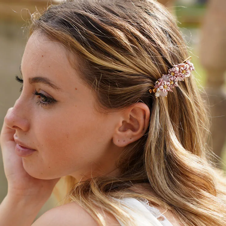 Fermaglio per capelli con fiori, oro, pietre e perle