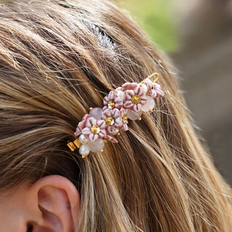Fermaglio per capelli con fiorellini in ceramica, perle di pietra naturale e perle d’acqua dolce.