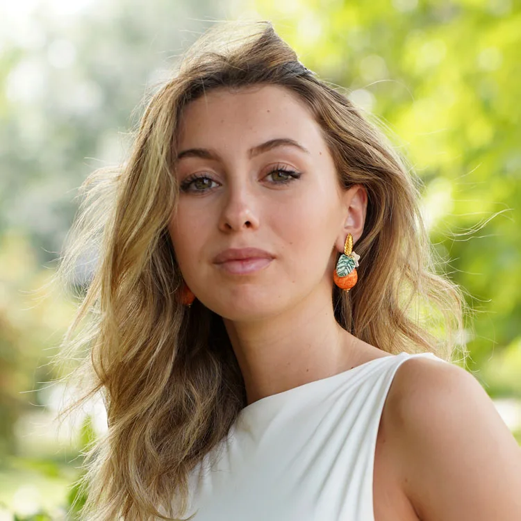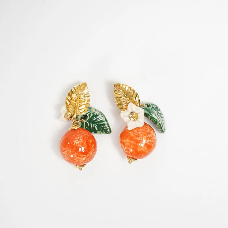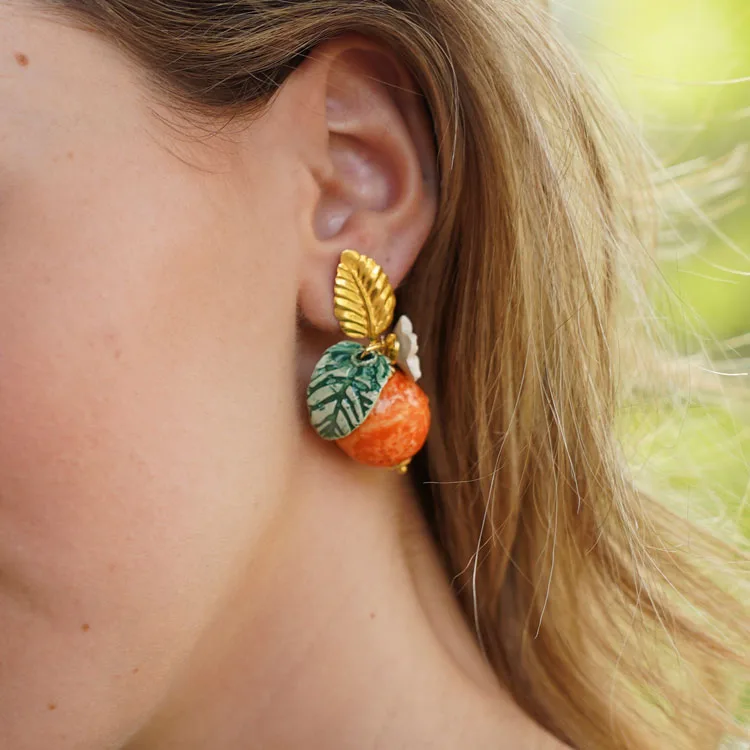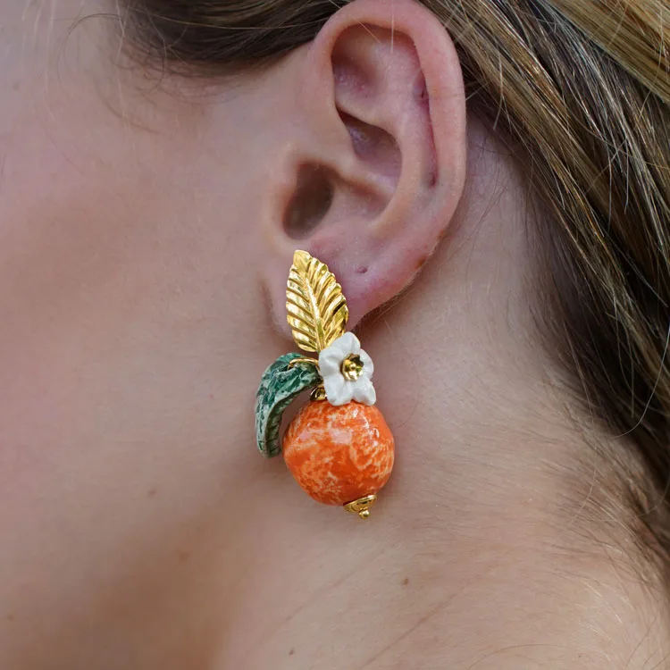 Questi orecchini in ceramica racchiudono tutta la luce e il sole dell’Italia. Le arance, le foglie e i fiori in ceramica sono modellati a partire dall’argilla. L’intero modello viene sezionato in due metà, svuotato scavando l’argilla in eccesso e quindi richiuso. Questa delicata operazione conferisce all’orecchino una piacevole leggerezza e una perfetta portabilità.