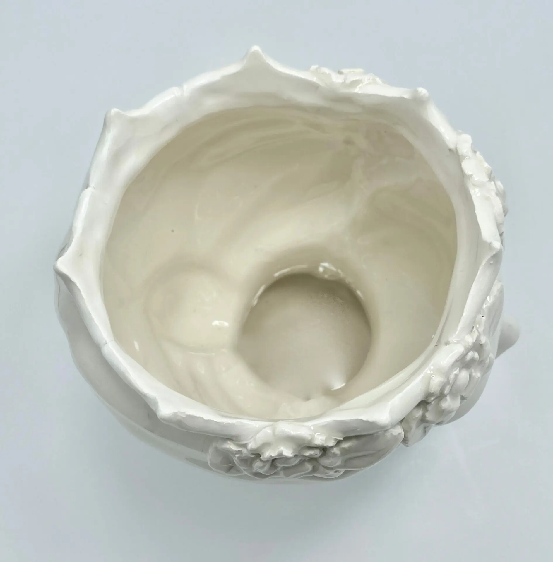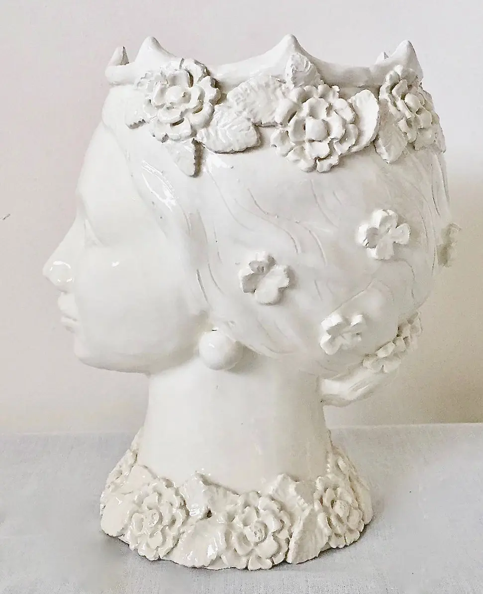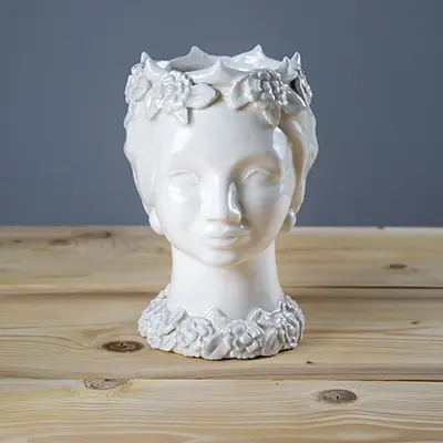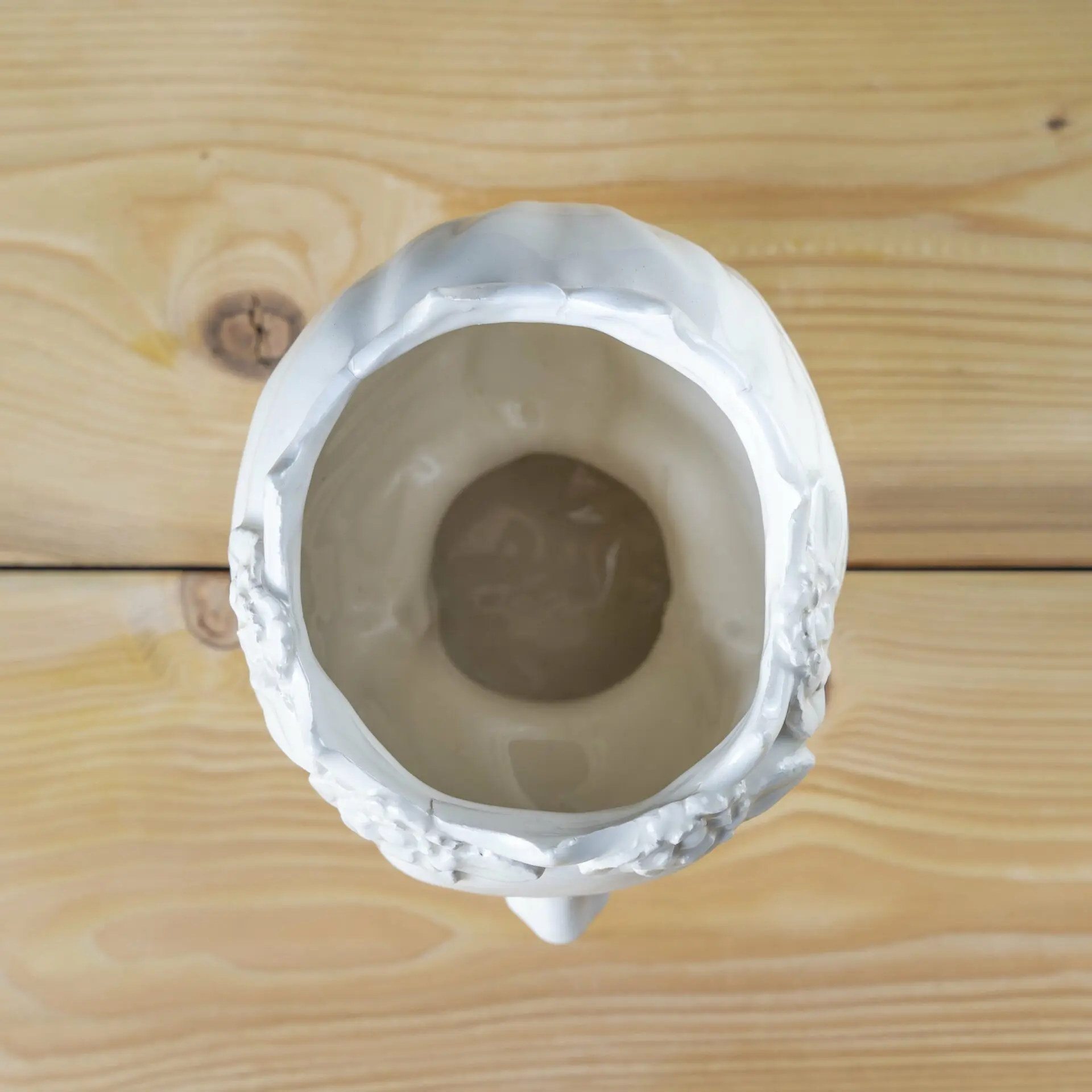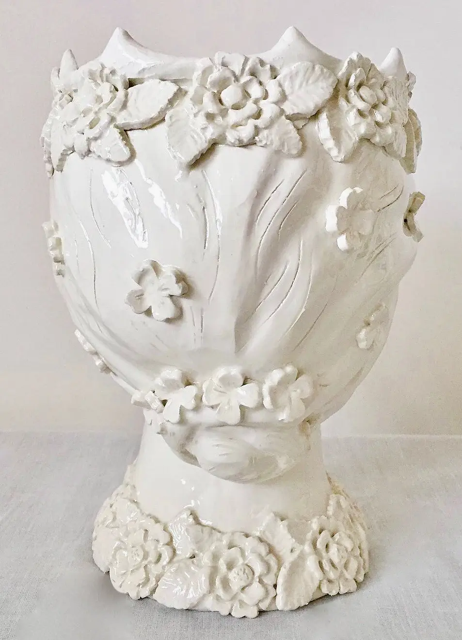 Questo vaso decorativo è realizzato in argilla bianca a colaggio. La smaltatura interna e l’apertura superiore consentono di utilizzarlo per portare un vaso di piccole dimensioni (max cm10). Il fondo non è forato, è possibile forarlo su ordinazione. La corona e i fiori sono applicati a mano e rifiniti nei minimi dettagli. Dopo la fase di essiccazione l’argilla viene cotta a 1000° centigradi. La terracotta viene così immersa nel bagno di cristallina trasparente. La seconda cottura avviene a 920° centigradi e serve per vetrificare e impermeabilizzare l’argilla.